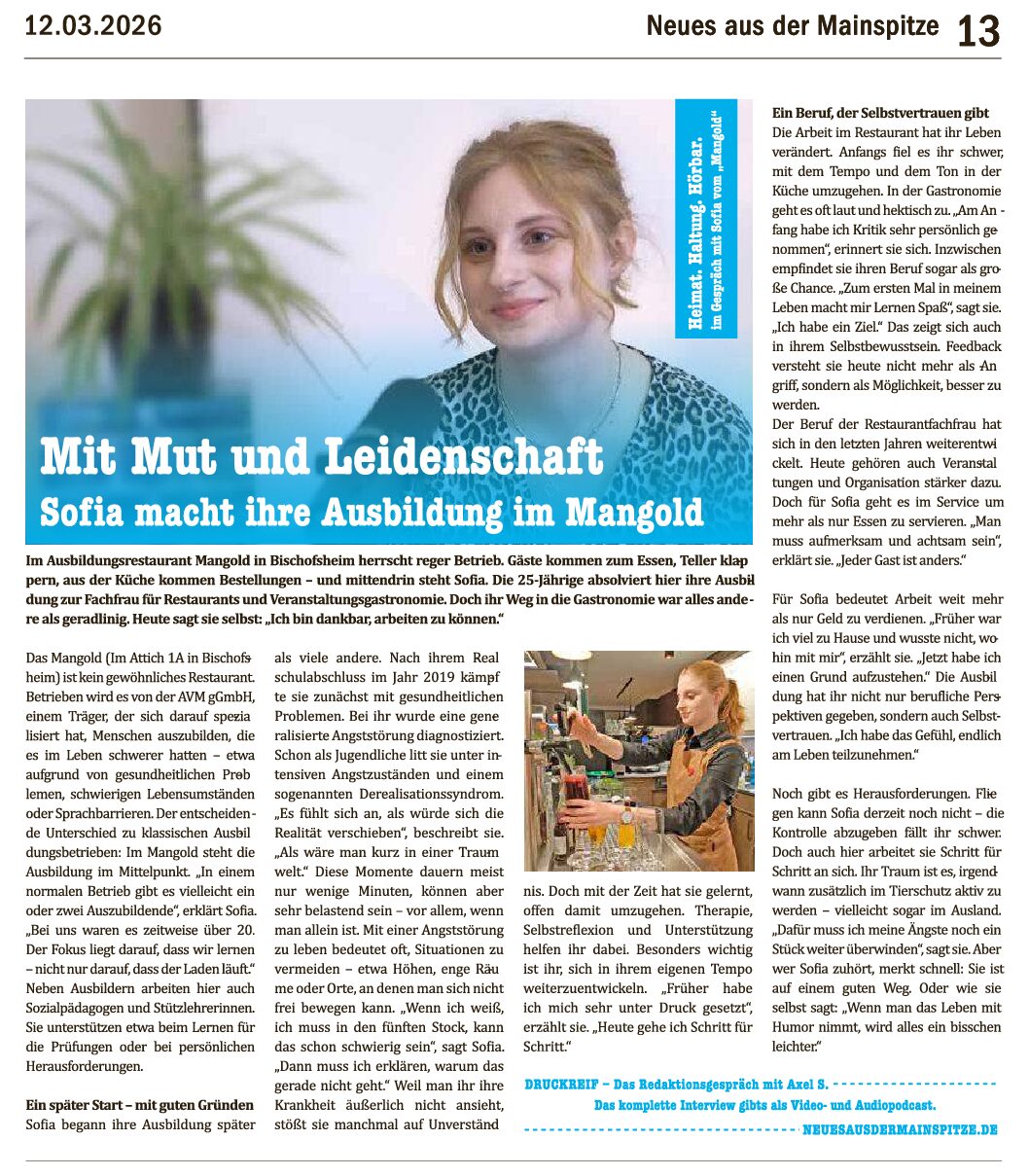 Beitrag im Magazin Neues aus der Mainspitze vom 12. März 2026 zur Ausbildung in unserem Ausbildungsrestaurant DAS MANGOLD.